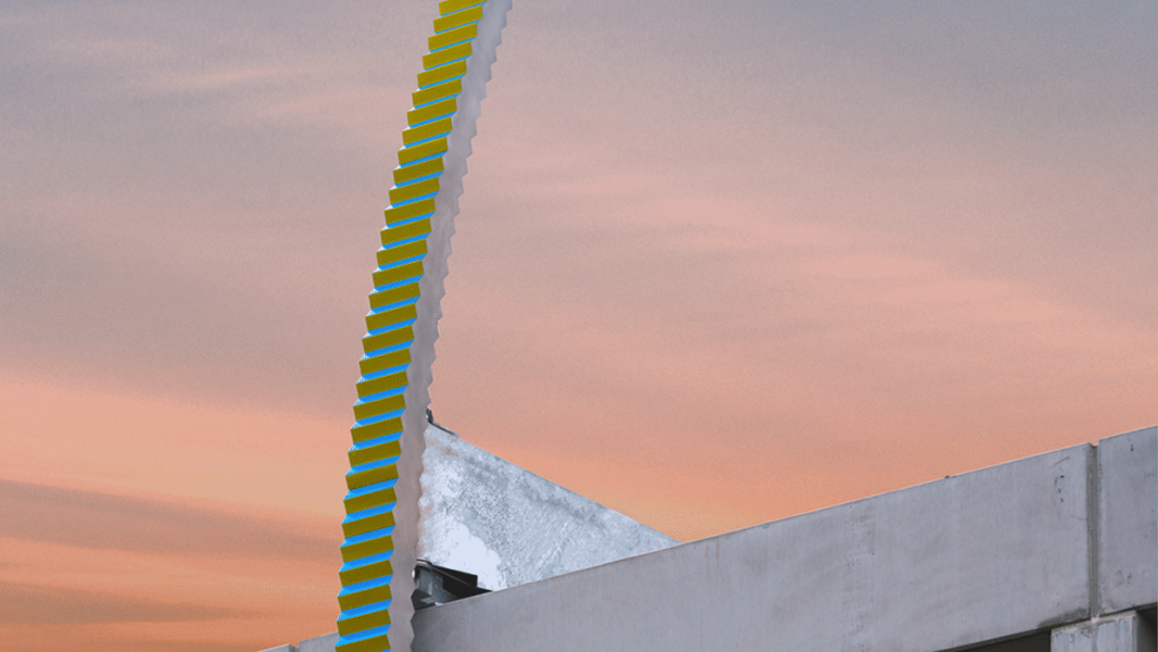 For the new prison in Haren, the artist duo Daems van Remoortere designed a permanent sculpture that aims to make time visible and tangible. In the courtyard, a passageway between the prison proper and the visitors' area, they installed Meetingpoint, a ten-meter-long circular segment that follows the position of the sun by computer. At a rate of four centimeters per day, the steel arch spans a total height difference of more than seven meters. The blue and yellow painted steps with which the arch is covered make the work continuously change color, like a tree changing throughout the seasons.